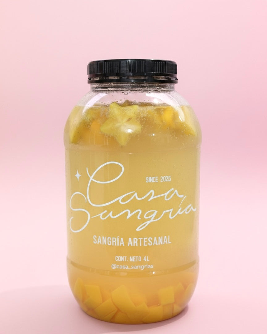 Casa Aurora es una sangría de frutos amarillos que mezcla durazno, lychee y carambolo, con un toque delicado de gin y licor de naranja.